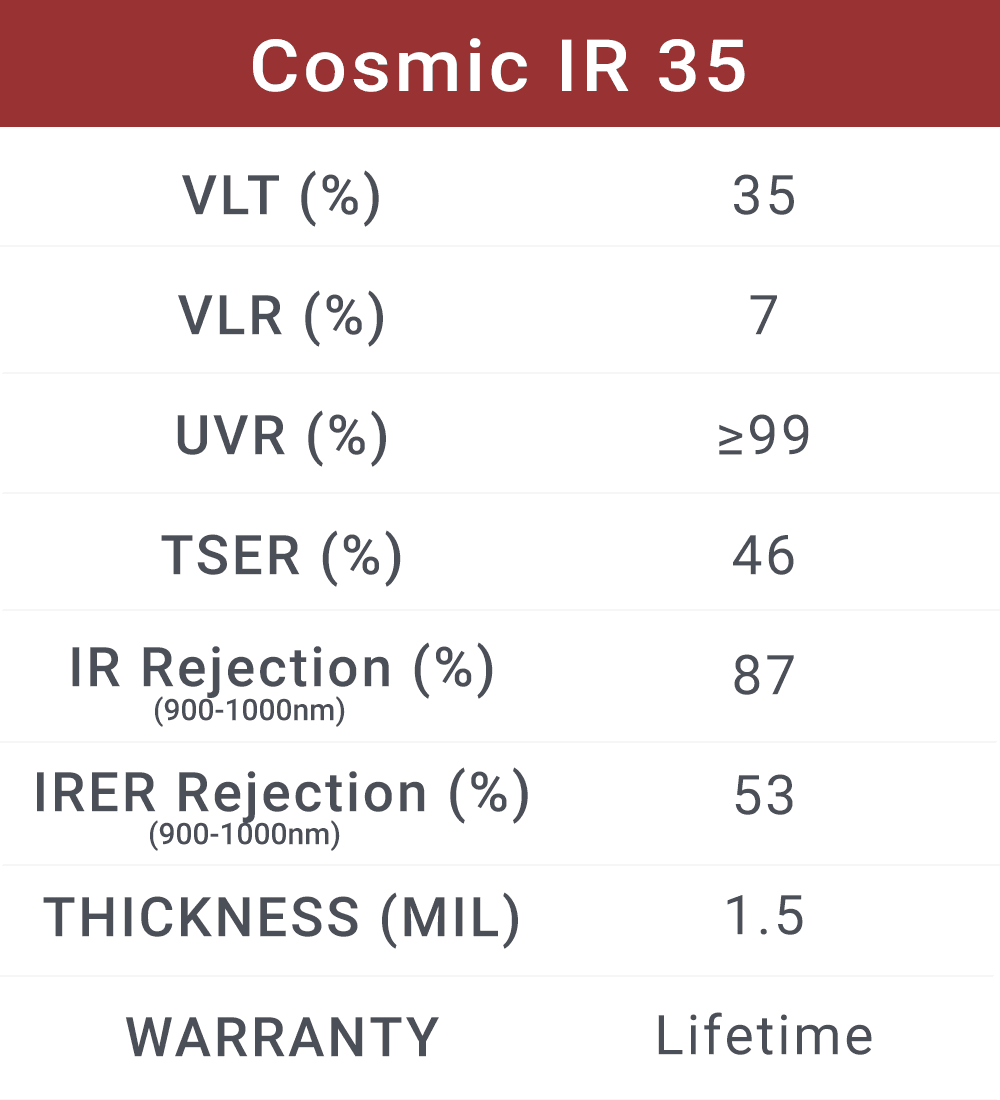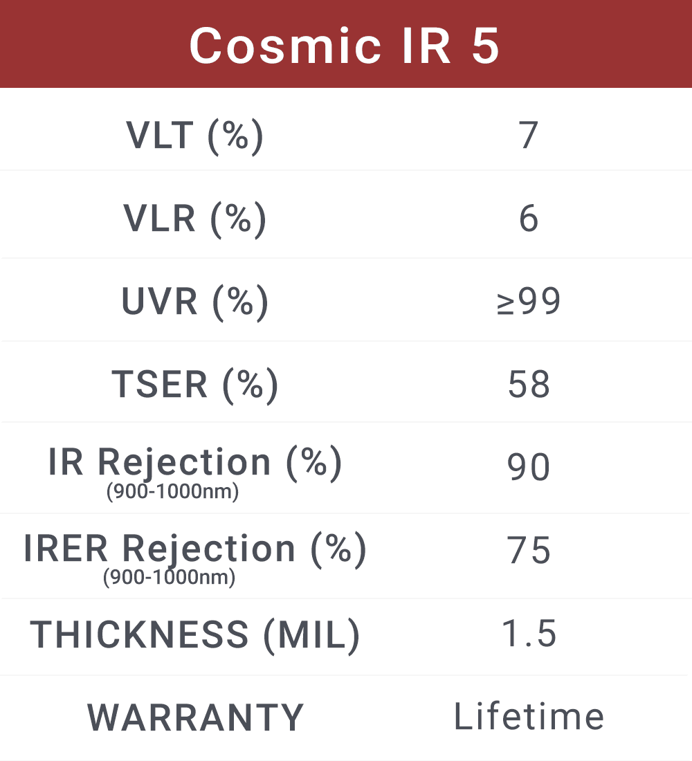 Our Carbon IR series is a 1.5 mil/2-ply color stable film with a lifetime warranty. This film does not interfere radio or GPS signals while providing a TSER up to 58%.